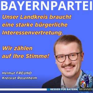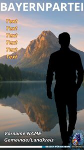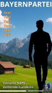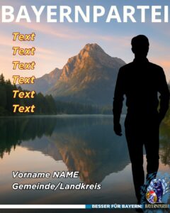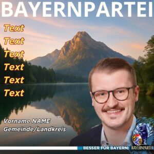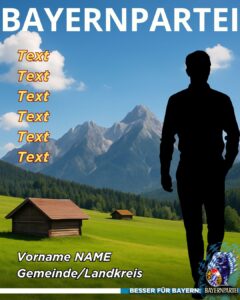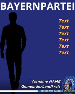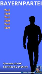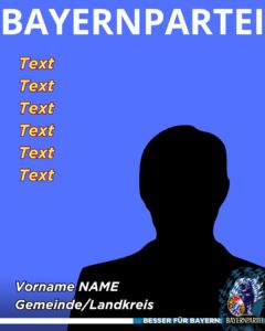 Z.B. Servus, Nadine! Ich kandidiere für den Gemeinderat Hintertupfing und hätte gerne Banner Nr. 10 – Zitatbanner Standard hellblau. Anbei ein passendes Bild von mir. Als Zitat würde ich mir „Heimat erhalten, Bayernpartei wählen!“ vorstellen. Vielen Dank!